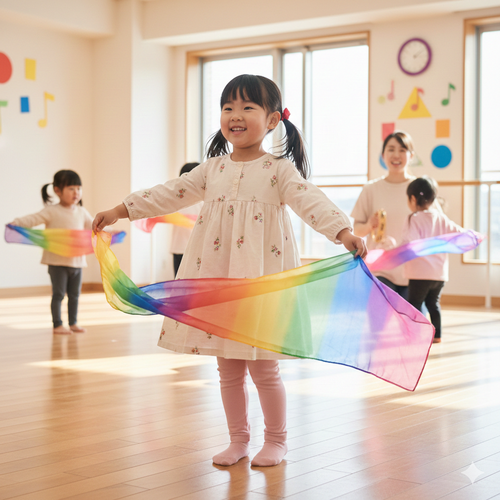 : スカーフを広げたり振ったりすることで、ダイナミックな動きを学びます。